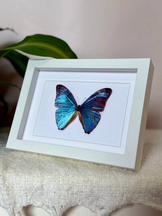 It is also standard for Morpho species to be preserved without an abdomen. This prevents major staining on their beautiful blue wings.