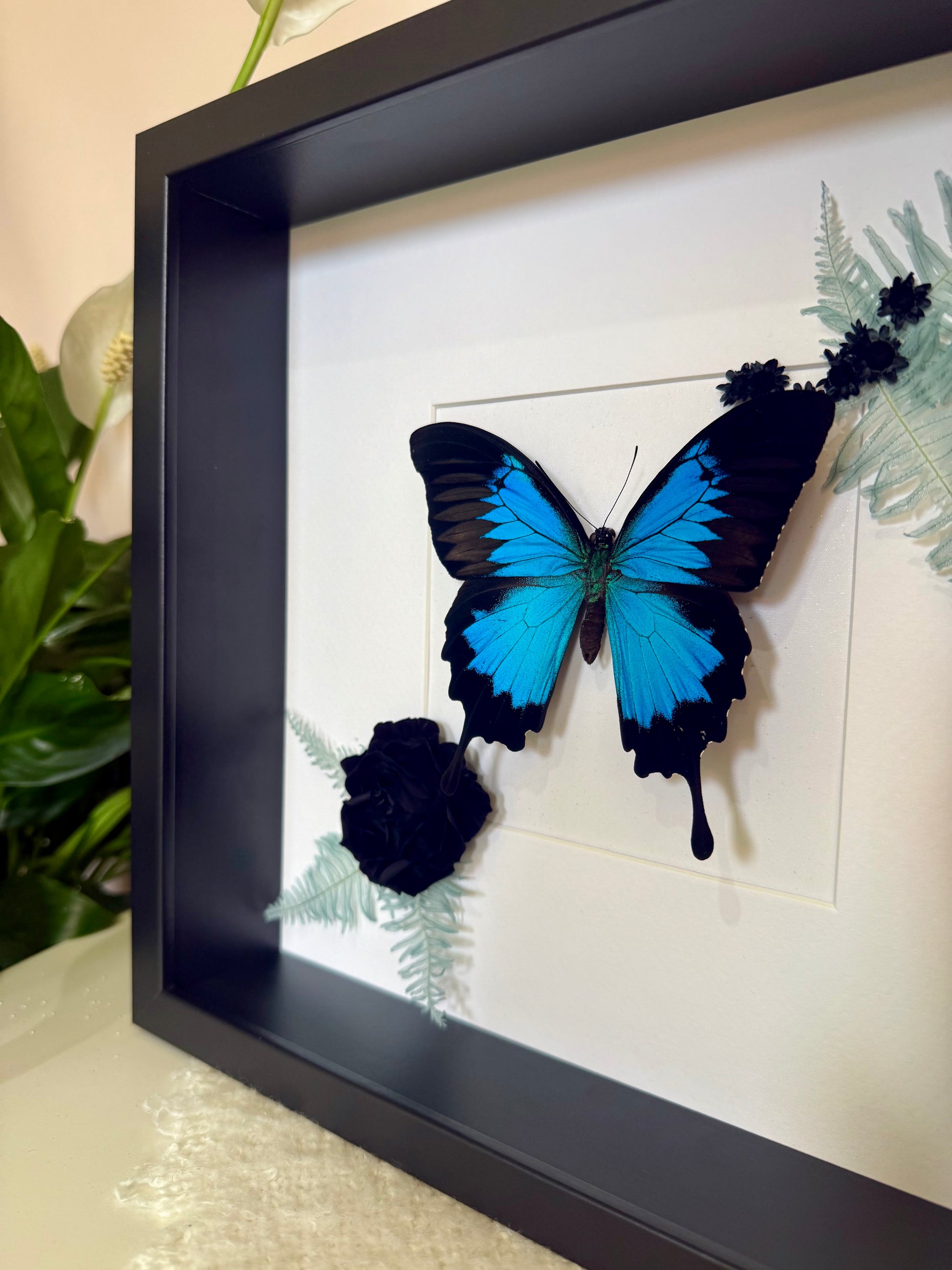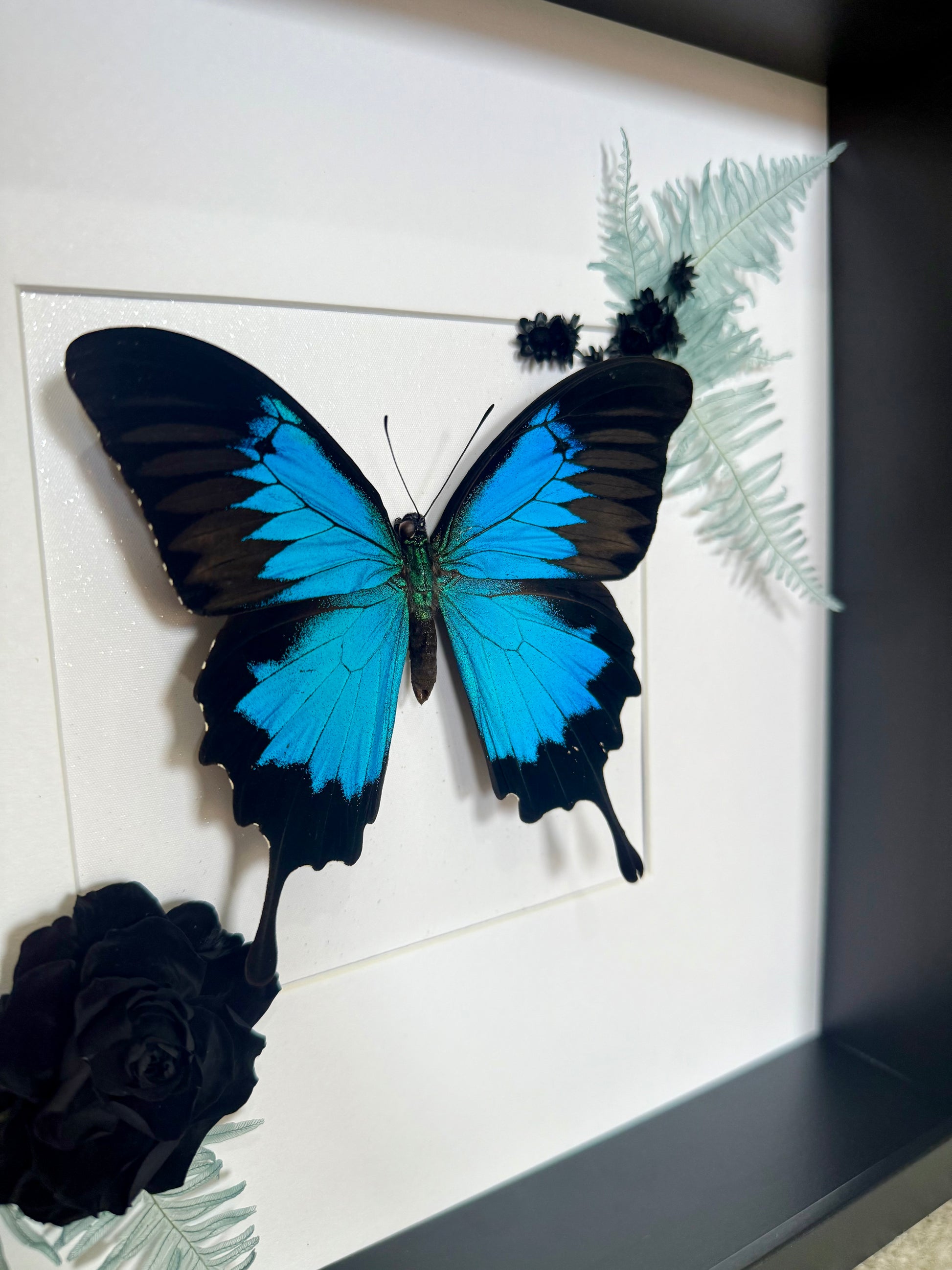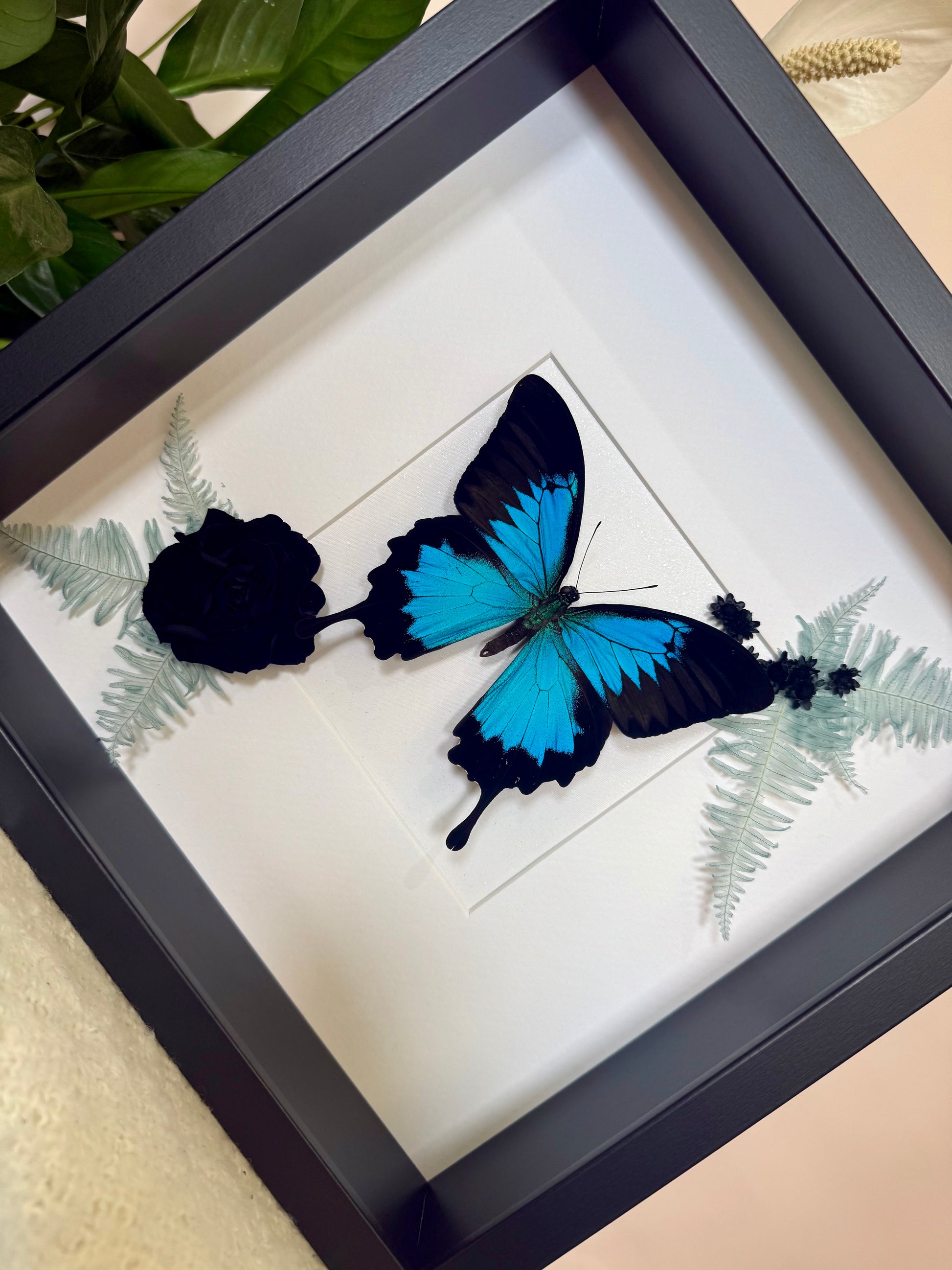 Native to the rainforests of Australia, Papua New Guinea and Indonesia, the Ulysses Butterfly (Papilio ulysses) is a stunning and vibrant species. Its electric blue patches pop against it's deep black wings, creating a dramatic and captivating contrast. The species is perfectly complemented here by preserved blue Mountain Fern, a jet-black rose, and delicate Spring Star flowers for a breath-taking natural display.