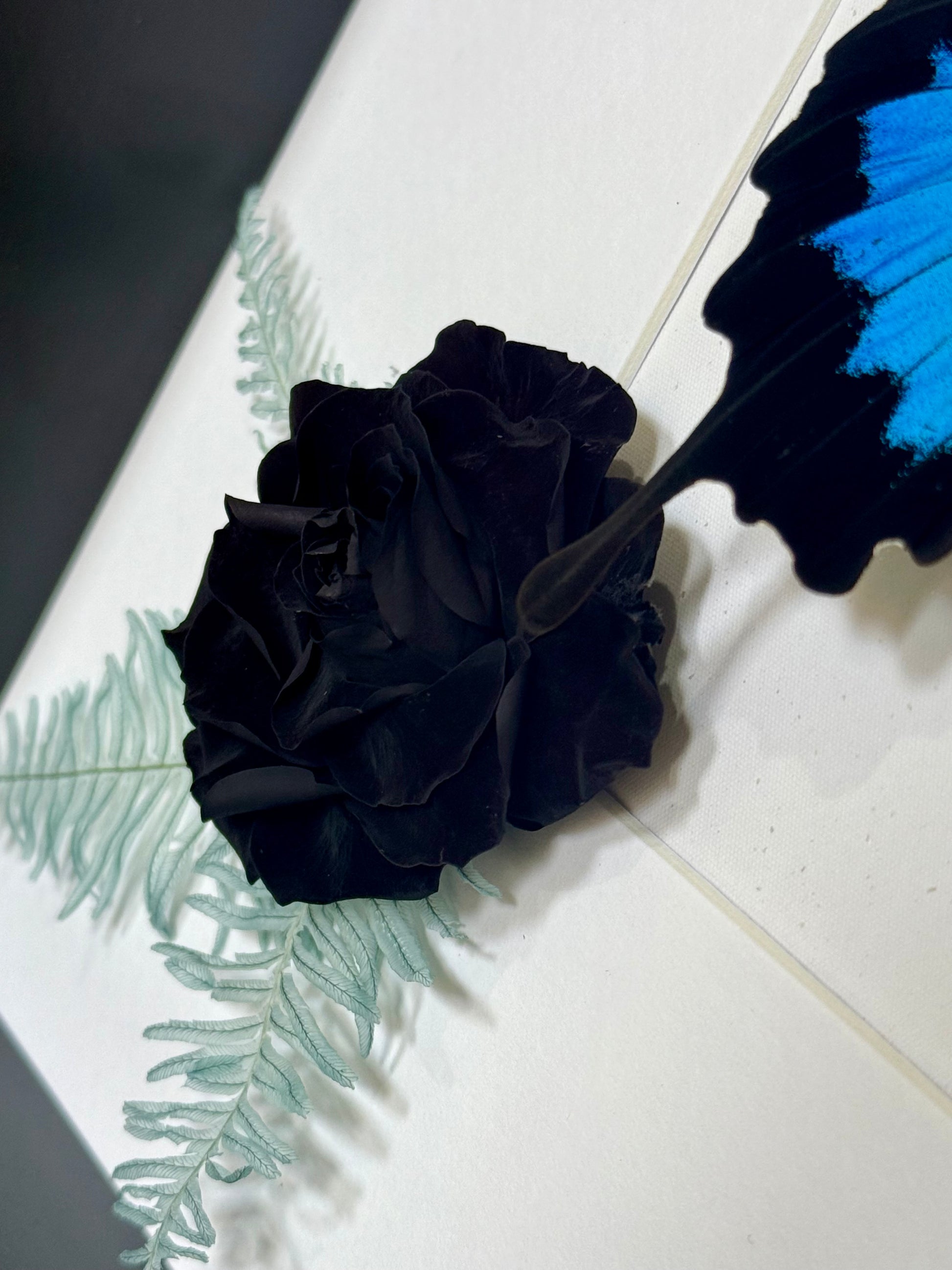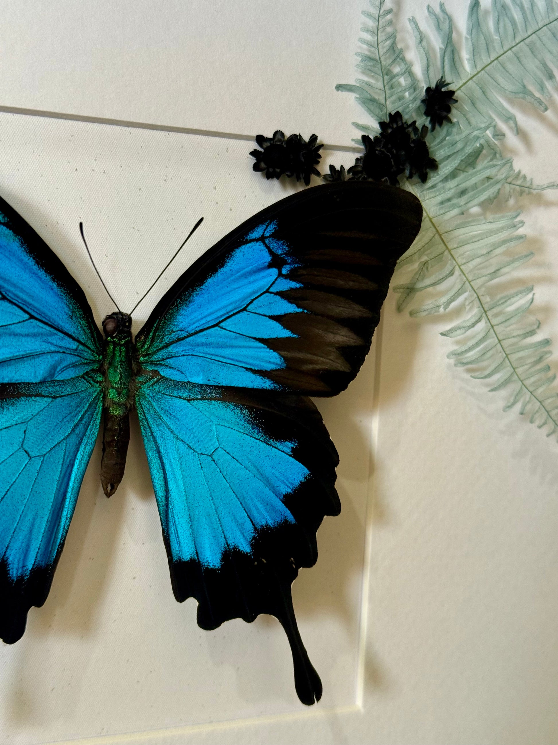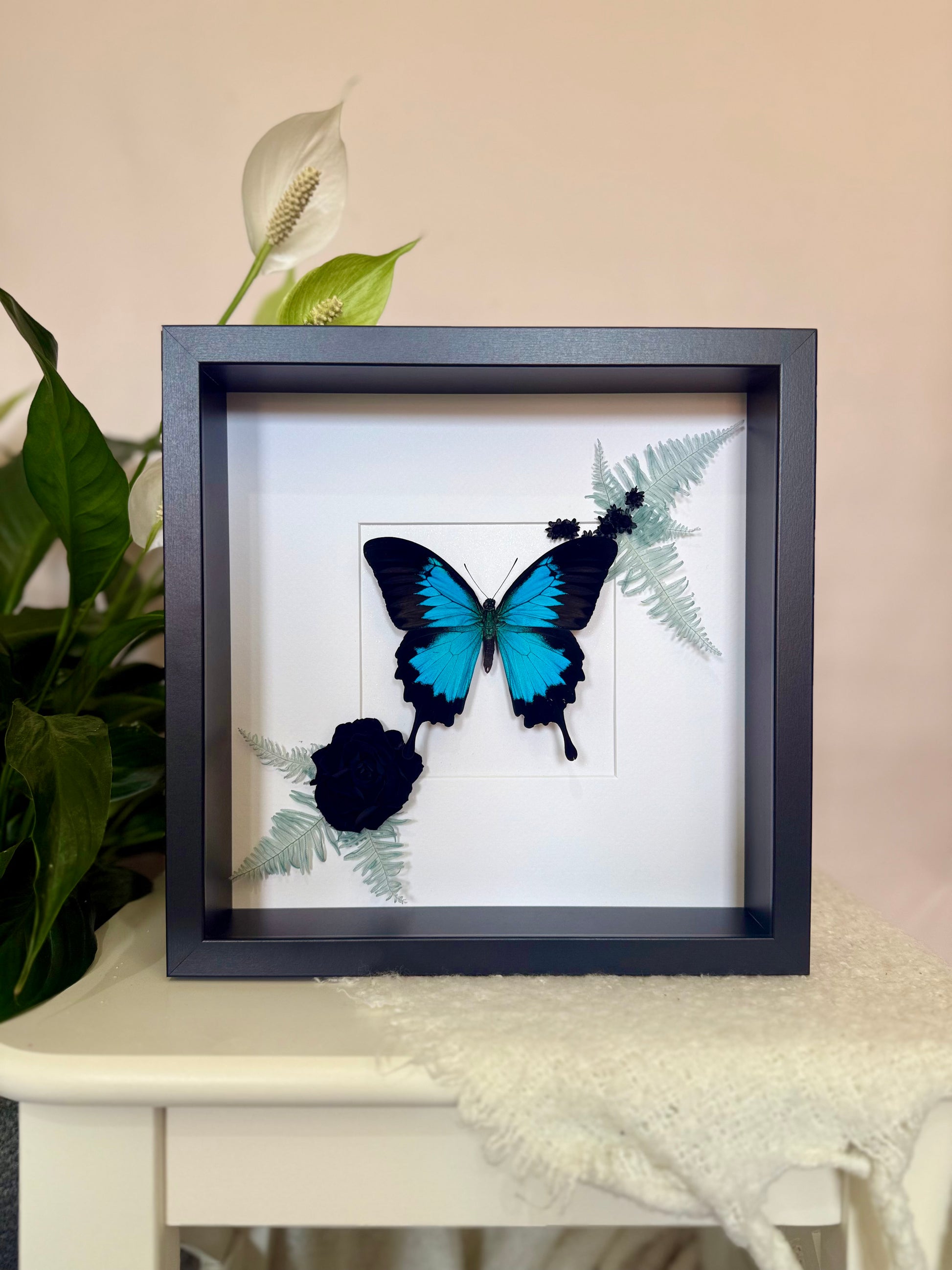Native to the rainforests of Australia, Papua New Guinea and Indonesia, the Ulysses Butterfly (Papilio ulysses) is a stunning and vibrant species. Its electric blue patches pop against it's deep black wings, creating a dramatic and captivating contrast. The species is perfectly complemented here by preserved blue Mountain Fern, a jet-black rose, and delicate Spring Star flowers for a breath-taking natural display.