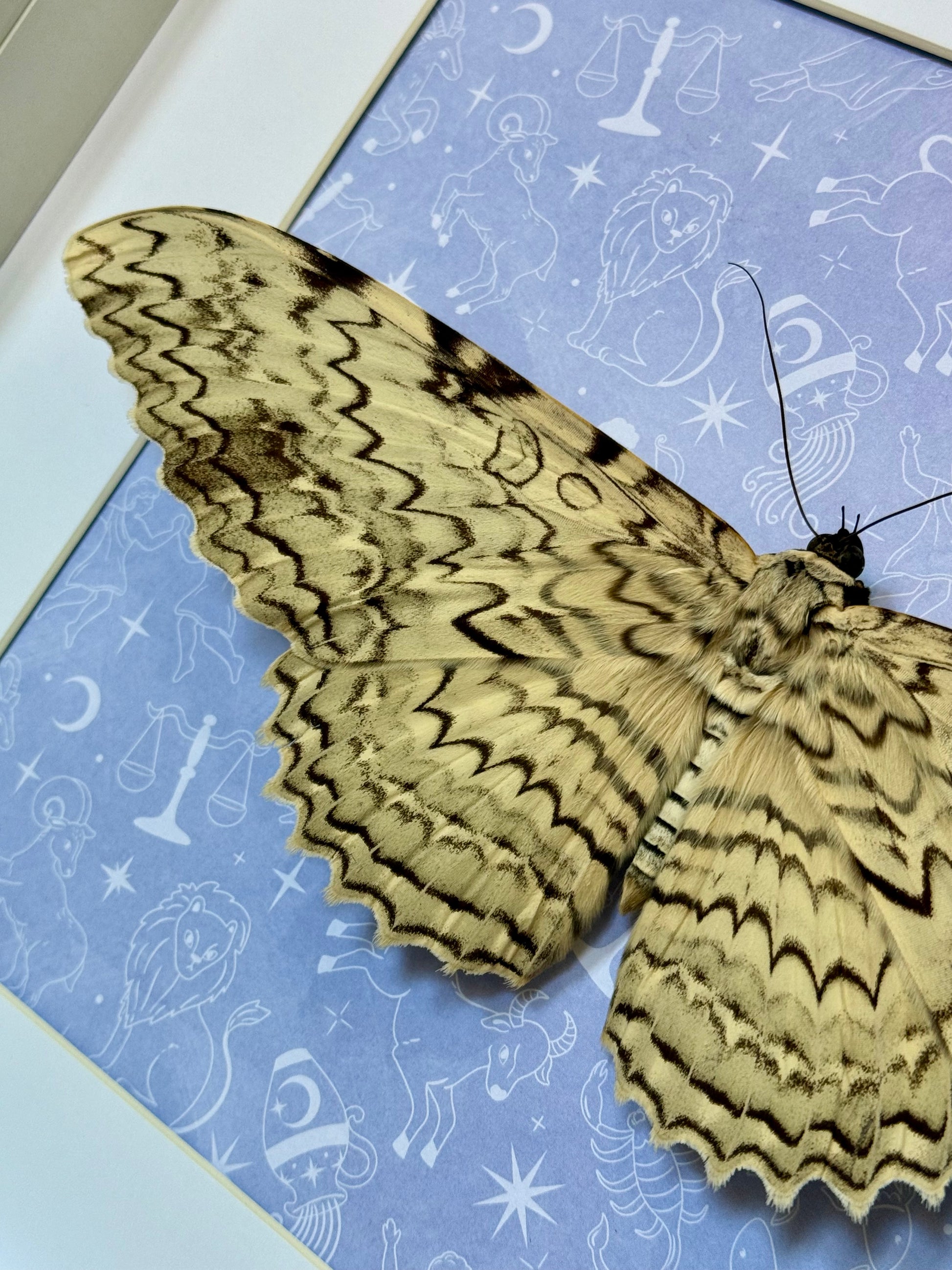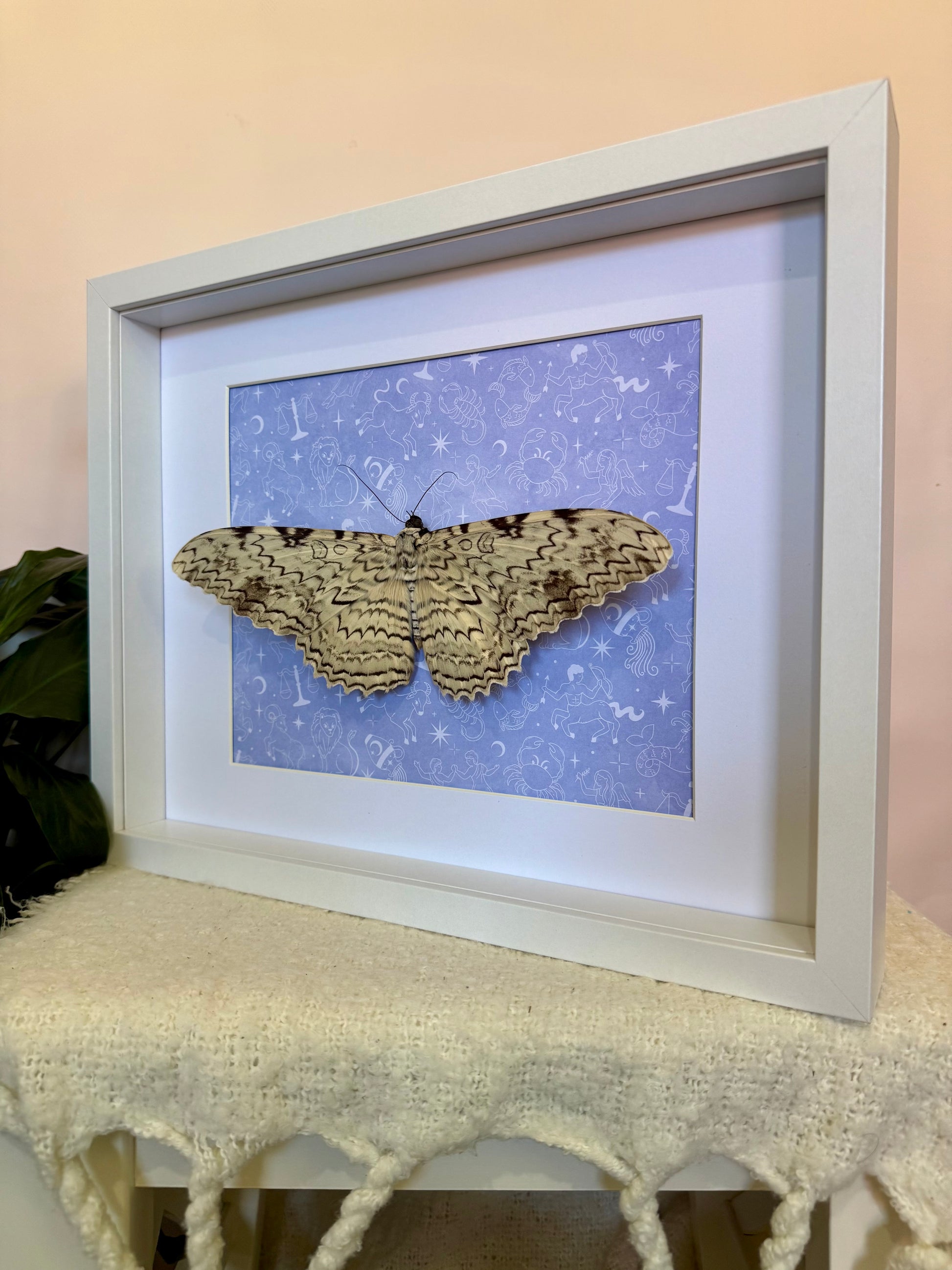 Native to the tropical and subtropical regions of Central and South America, the White Witch Moth (Thysania agrippina) is celebrated for its extraordinary size and ghostly pale wings patterned with delicate, bark-like markings that provide excellent camouflage against tree trunks. With a wingspan often reaching up to 30 cm, it holds the record for the largest wingspan of any moth or butterfly, making this remarkable specimen a bold and intriguing statement piece for any interior.